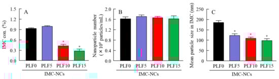 Dispersibility, nanoparticle number, and size of IMC in IMC-NPs, IMC-NC/PLF5, IMC-NC/PLF10, and IMC-NC/PLF15 one month after the preparation. Ophthalmic IMC-NC formulations stored at 20 °C for one month. (A) IMC concentration at 5 mm under surface of each ophthalmic IMC-NC formulation stored for one month (dispersibility). IMC (B) nanoparticle number and (C) size in each ophthalmic IMC-NC formulation one month after preparation. (B,C) Ophthalmic IMC-NC formulations were gently stirred before measurement. Compositions of each ophthalmic IMC-NC formulation shown in Table 1; n = 5; * p < 0.05 vs. PLF0 (IMC-NPs) for each category. For IMC-NPs and IMC-NC/PLF5, IMC-NCs were evenly dispersed throughout, although in IMC-NC/PLF10 and IMC-NC/PLF15, the upper layer was poor in IMC-NCs and the lower layer was rich in IMC-NCs at one month after preparation. On the other hand, PLF-127 enhanced the stability of IMC-NCs.