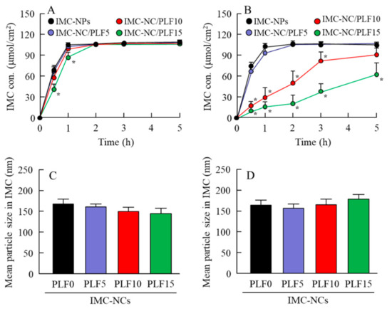 Diffusion of IMC-NCs in each ophthalmic IMC-NC formulation through methacrylate cell. Diffusion behavior of IMC-NCs in IMC-NPs, IMC-NC/PLF5, IMC-NC/PLF10, and IMC-NC/PLF15 at (A) 10 °C and (B) 37 °C. Mean particle size of IMC in reservoir chamber of methacrylate cell with each applied ophthalmic IMC-NC formulation at (C) 10 °C and (D) 37 °C. The compositions of each ophthalmic IMC-NC formulation are shown in Table 1; n = 8; * p < 0.05 vs. IMC-NPs for each category. The diffusion of IMC-NCs decreased with PLF-127. In particular, the release of IMC-NCs from gelled IMC-NC/PLF10 and IMC-NC/PLF15 at 37 °C was lower in comparison with IMC-NC without PLF-127 (IMC-NPs).