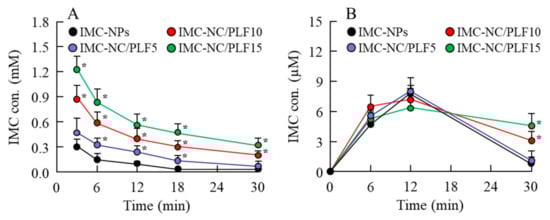 IMC levels in (A) lacrimal fluid (LF) and (B) blood of rabbits instilled with each ophthalmic IMC-NC formulation. Compositions of each ophthalmic IMC-NC formulation shown in Table 1; n = 6–8; * p < 0.05 vs. IMC-NPs for each category. Retention time of IMC levels in rabbit LF was enhanced with PLF-127 in IMC-NC-incorporating ISG. Addition of PLF-127 delayed IMC elimination in blood after instillation.
