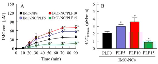 In vivo transcorneal penetration of each ophthalmic IMC-NC formulation. (A) Changes in IMC levels in rabbit LF instilled with each ophthalmic IMC-NC formulation. (B) Area under drug concentration–time curve between 0 and 90 min (AUC0–90min) in aqueous humor of rabbits instilled with each ophthalmic IMC-NC formulation. Compositions of each ophthalmic IMC-NC formulation shown in Table 1; n = 5–8; * p < 0.05 vs. IMC-NPs for each category. Introduction of 5% and 10% PLF-127 increased IMC transcorneal penetration in rabbits instilled with IMC-NC-incorporating ISG. In contrast to results for optimal PLF-127 (5% and 10%), excessive PLF-127 (15%) decreased IMC-NC uptake after instillation.