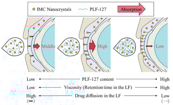 Thermosensitive ISGs, such as PLF-127, have solution–gel transition properties, and they can prolong drug residence time on the cornea by converting the eye-drop formulations from a solution type to a gel upon instillation [35,36]. We also measured corneal toxicity and IMC content in the LF and aqueous humor of rabbits instilled with the IMC-NC-incorporating ISG. Corneal toxicity was not observed in rabbits repetitively instilled with the IMC-NC-incorporating ISG for one month, and the retention time of IMC levels in the LF of rabbits was enhanced with PLF-127 in the IMC-NC-incorporating ISG (Figure 5A). On the other hand, formulations with 5% and 10% PLF-127 increased the transcorneal penetration of IMC in rabbits instilled with the IMC-NC-incorporating ISG, although excessive PLF-127 (15%) decreased the uptake of IMC-NCs after instillation (Figure 5A). We previously reported the 2 pathway was related the corneal penetration of IMC-NCs. One pathway is that IMC-NCs were attached onto the cornea after the instillation of ophthalmic dispersions containing IMC-NCs (IMC-NPs), and dissolved IMC in the formulation penetrate through the cornea and be released into the aqueous humor [20,21]. Another pathway is that the IMC-NCs are taken up into the corneal epithelium by energy-dependent endocytosis (CavME, CME and MP pathways), especially CavME, and cross to the corneal stromal side. From there, the IMC-NCs are dissolved in the cornea and released into the aqueous humor in a soluble form. From the 2 pathways, an enhancement of BA in the IMC-NCs was led [21]. In addition, Kim et al. highlight the importance of formulations that conform to the ocular surface before viscosity enhancement for increased and prolonged ocular surface contact and drug absorption [37]. Thus, the ratio of attachment in corneal tissue to the corneal penetration of IMC in IMC-NC/PLF15, and the ratio of attachment of IMC-NCs and corneal tissue may be low in comparison with other IMC-NC-incorporating ISG with 5% and 10% PLF-127, since the release and the diffusion of IMC-NCs from IMC-NC/PLF15 were significantly reduced compared to ophthalmic IMC-NP formulations with and without 0–10% PLF-127 (Figure 4). Taken together, we hypothesize that enhanced viscosity prolongs the precorneal resident time of IMC-NCs. On the other hand, the diffusion of IMC-NCs into the LF was decreased while viscosity was increased, resulting in corneal permeation and enhanced drug BA (Figure 7). Further studies using medium-sized animals, such as rabbits, pigs, and monkeys, are needed to elucidate the usefulness of the PLF-127-based IMC-NC-incorporating ISG, since organizational structure and drug behavior in the eye are different in rats and humans.