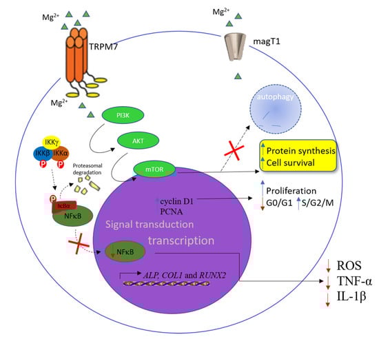 On the hematopoietic cell surface, transient receptor potential cation channel subfamily M member 7 (TRPM7) and magnesium transporter 1(MagT1) facilitate magnesium influx into the cell. In the cytoplasm, the phosphoinositide 3-kinase (PI3K)/protein kinase B (Akt)/mammalian target of rapamycin (mTOR) pathway is magnesium-sensitive, and the activation of this signaling cascade induces cell growth, proliferation, and the inhibition of autophagy. Additionally, increased Mg2+ concentration is able to decrease proinflammatory cytokine production, by inhibiting the nuclear translocation and phosphorylation of nuclear factor kappa B (NF-κB) and rise in basal inhibitor of NF-κB (IĸBα) levels, downregulating tumor necrosis factor alpha (TNF-α) and interleukin (IL)-1β release, and reducing ROS production. Solid black arrows indicate the pathway activated, while dot black arrows indicate the pathways inhibited. Red arrows pointing down indicates reduction, while blue arrows pointing up indicates increase.
