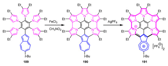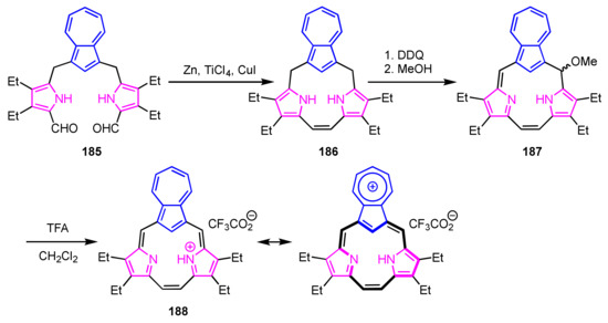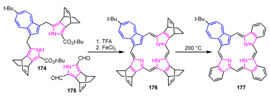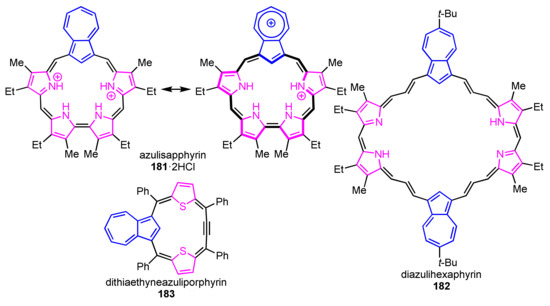 - Graham, S.R.; Colby, D.A.; Lash, T.D. An Azulene Analogue of the Tripyrranes and Carbaporphyrinoids Therefrom. Angew. Chem. Int. Ed. 2002, 41, 1371–1374. [Google Scholar] [CrossRef]