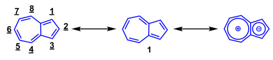 Azulene (1) is one of the 10π-electron non-benzenoid aromatic hydrocarbons having a fused structure of 5- and 7-membered rings. Azulene (1) is one of the structural isomers of naphthalene, however, the color of these isomers differ greatly from each other. Despite the fact that naphthalene is a colorless compound, azulene (1) shows a beautiful blue color. The name “azulene” derives from the Arabic word “azur” and the Spanish word “azul” which both mean “blue”. Azulene (1) has the contribution of the cyclopentadienide and tropylium substructures as shown in Scheme 1. Hence, despite being a hydrocarbon, azulene (1) shows a relatively large dipole moment (1.08 debye). Furthermore, electrophilic substitution reaction of azulene (1) proceeds at 1-, 3-, 5-, and 7-positions, while nucleophilic addition reaction takes place at 4-, 6-, and 8-positions. Some azulene derivatives have pharmacological activity, and azulene sulfonic acid derivatives are especially used as anti-inflammatory drugs [1,2,3]. In recent years, azulene derivatives have also been reported to exhibit anti-tumor activity [4,5,6,7].