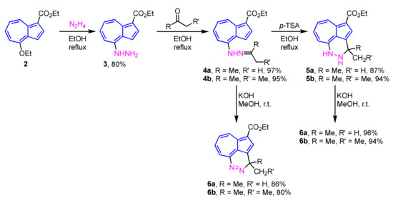In 2010, Wu et al. reported the two- or three-step synthesis of azulenopyridazines 6a and 6b from 4-hydrazinylazulene 3, which were prepared by the SNAr reaction of 4-ethoxyazulene 2 with hydrazine (N2H4) [18]. The reaction of 3 with ketones in EtOH gives the corresponding hydrazones 4a and 4b in excellent yields. When the hydrazones 4a and 4b are treated with p-toluenesulfonic acid (p-TSA), dihydropyridazines 5a and 5b can be obtained in 87% and 94% yields, respectively. Both hydrazones 4a, 4b and dihydropyridazines 5a, 5b afford the corresponding azulenopyridazines 6a and 6b by the treatment with KOH in MeOH in excellent yields (Scheme 2).
