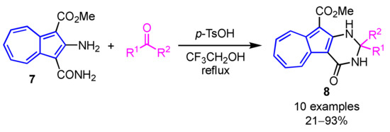 A facile synthesis of 2-substituted 2,3-dihydro-4(1H)-azuleno[2,1-d]pyrimidinones 8 was demonstrated by Wang and co-workers (Scheme 3) [19]. In their procedure, Brønsted acid-catalyzed reaction of 2-amino-3-carbamoylazulene 7 with ketones or aldehydes in 2,2,2-trifluoroethanol gives the azulene-fused dihydropyrimidinones 8 in moderate to excellent yields.