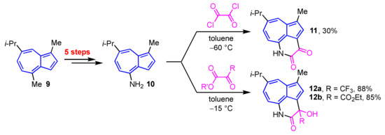 Yli-Kauhaluoma et al. reported the synthesis of azulene-fused δ-lactams 11, 12a, and 12b by the sequential nucleophilic and intramolecular cyclization reactions of 4-aminoazulene (10), which was prepared from guaiazulene (9) in five steps, including Curtius–Schmidt rearrangement, with the corresponding 1,2-diketones (Scheme 4) [20].