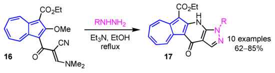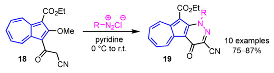 In 2013, Wang et al. developed a preparation method of 11H(2H)-4-oxopyrazolo[3′,4′:6,5]pyrido[3,2-a]azulene derivatives 17 by the domino reaction of 16 with hydrazines in moderate to good yields (Scheme 6) [22]. A simple procedure for azuleno[2,1-b]pyridazines 19 was also reported by the same group. In this reaction, azuleno[2,1-b]pyridazines 19 are obtained by the condensation between 1-cyanoacetyl-2-methoxyazulene 18 and aryldiazonium salts in pyridine in good yields (Scheme 7) [23].