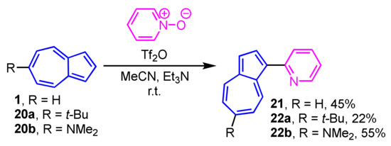 The Reissert–Henze-type reaction is applicable to the synthesis of 1-(2-pyridyl)azulene (21) and its derivatives 22a and 22b. The reaction of 1, 20a and 20b with pyridine N-oxide in the presence of trifluoromethanesulfonic anhydride (Tf2O) yields 21, 22a and 22b in moderate to good yields (Scheme 8) [24]. This procedure is also applicable to the substituted pyridine N-oxides and quinoline N-oxide, which react with azulenes to produce the corresponding 1-(2-pyridyl- and 2-quinolyl)azulenes.
