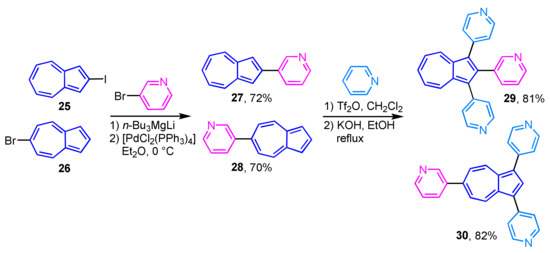 The palladium-catalyzed cross-coupling reaction of 2-iodoazulene (25) and 6-bromoazulene (26) with lithium pyridyl and quinolyl magnesium ate-complexes affords the corresponding 2- and 6-heteroarylazulene derivatives 27 and 28 in good to excellent yields (Scheme 10) [26]. The reaction of 27 and 28 with pyridine in the presence of Tf2O and subsequent aromatization with KOH gives the corresponding tris(heteroaryl)azulenes 29 and 30.