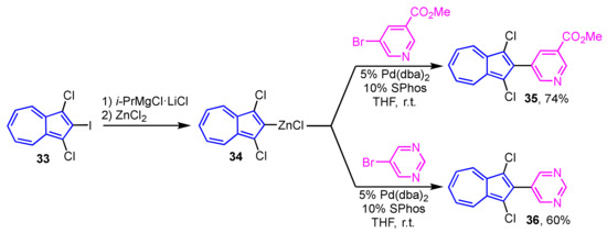 Preparation of 2-heteroarylazulenes by the Negishi cross-coupling reaction was achieved in two ways by Bredihhin et al. The first is the reaction of 2-bromoazulene (31) with a zinc reagent of the heterocycles, where the cross-coupling reaction of 31 with 4-pyridyl zinc reagent at room temperature yields 2-(4-pyridyl)azulene (32) in 76% yield (Scheme 11) [27]. In another way, 2-azulenyl zinc reagent 34, which is prepared from 2-iodoazulene derivative 33, reacts with heteroaryl bromides at room temperature to give 2-(pyridyl- and primidinyl)azulene derivatives 35 and 36 in good yields. In this case, the 2-azulenyl zinc reagent 34 can be prepared by the direct metalation of 1,3-dichloro-2-iodoazulene (33) precursor with i-PrMgCl·LiCl, then transmetalation with zinc chloride (Scheme 12) [28].