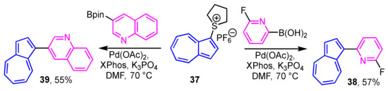 1-Haloazulenes, such as 1-bromo- and 1-iodoazulenes, are known to be unstable compounds. Lewis and co-workers demonstrated the preparation of 1-heteroarylazulenes by the cross-coupling reaction of aryl boronic acids with 1-azulenylsulfonium salt 37, instead of the 1-haloazulenes [29]. In this procedure, the reaction of the 1-azulenylsulfonium salt 37 with the boronic acids or acid esters of the heterocycles in the presence of a palladium/XPhos catalyst affords the corresponding 1-heteroarylazulenes 38 and 39 (Scheme 13). This method is also applicable to the synthesis of 1-(2-thienyl)azulenes. Details of the synthesis of these derivatives are described later.