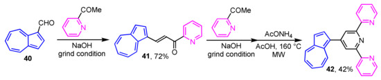 In 2016, Nica et al. reported the multistep synthesis of 2,2′:6′,2′′-terpyridine-substituted azulene derivatives under the Kröhnke-type reaction conditions (Scheme 14) [30]. Condensation of 40 with 2-acetylpyridine under grinding conditions leads to the corresponding azulene-substituted chalcone 41 in 72% yield. Compound 41 is subjected to further reaction with 2-acetylpyridine under the same conditions, then the microwave (MW) irradiation in the presence of ammonium acetate to form 4-(1-azulenyl)terpyridine 42 in 42% yield.