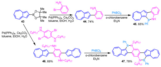 The polycyclic aromatic hydrocarbons (PAHs) in which a part of the C=C moiety is replaced with a B–N unit has attracted considerable attention in the field of materials science. Recently, Gao et al. reported the preparation of two azulene-fused BN-heterocycles 45 and 47 via aromatic borylation of 44 and 46 (Scheme 15) [31]. Compounds 45 and 47 exhibit unique absorption and fluorescence properties unlike those of previously reported BN-embedded PAHs. Furthermore, 45 and 47 show high sensitivity toward fluoride ion, and a remarkable color change is observed by the addition of the ion.