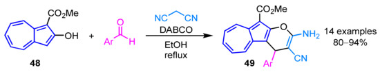 In 2012, Wang et al. reported the synthesis of 2-amino-3-cyano-4-aryl-10-ethoxycarbonylazuleno[2,1-b]pyrans 49 from 2-hydroxyazulene derivative 48 (Scheme 16) [32]. The three-component cascade reaction of 48, arylaldehydes and malononitrile in the presence of diazabicyclo[2.2.2]octane (DABCO) as a base produces the corresponding products 49 in excellent yields.