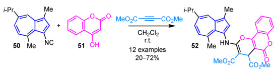 Sato et al. demonstrated the preparation of tricyclic compound 52 connected with 3-aminoguaiazulene by the multicomponent reaction of 3-isocyanoguaiazulene 50, dimethyl acetylenedicarboxylate (DMAD), and 4-hydroxycoumarin (51) (Scheme 17) [33]. This reaction also allows synthesis of the corresponding furan or hydropyridine derivatives by using an aldehyde or aniline derivatives instead of 4-hydroxycoumarin.