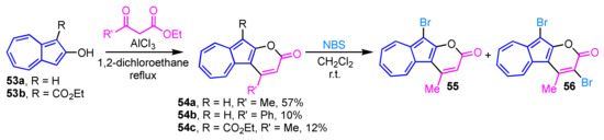 The AlCl3-mediated cyclization reaction of 2-hydroxyazulenes 53a and 53b with activated methylene compounds gives pyrone-fused azulene derivatives (azulenopyranones 54a–54c) in low to moderate yields (Scheme 18) [34]. The reaction of 54a with N-bromosuccinimide (NBS) results in conversion into the bromides 55 and 56. When one equivalent of NBS is used, 55 is obtained in 42% yield along with 56 in 31% yield. While, the dibromo derivative 56 is selectively generated in excellent yield (91%), when two equivalents of NBS is employed. Compounds 55 and 56 can be further functionalized by the palladium-catalyzed cross-coupling reaction.