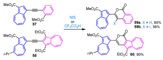 Intramolecular cyclization of alkyne 57 in the presence of trifluoroacetic acid produces isocoumarin derivative 59a in excellent yield (Scheme 19) [35], whereas iodocyclization of alkyne 57 with N-iodosuccinimide (NIS) gives the corresponding 4-iodoisocoumarin 59b in moderate yield. Similarly, alkyne 58 having two azulenyl moieties is treated with trifluoroacetic acid in a mixed solvent of THF and water to give pyrone-fused azulene 60 in 90% yield [36].