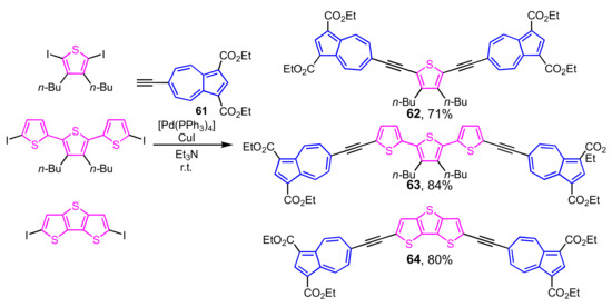 Preparation of bis(6-azulenylethynyl)thiophene 62, terthiophene 63, and dithienothiophene 64 is examined by the palladium-catalyzed cross-coupling reaction of 6-ethynylazulene 61 with diiodothiophene and the corresponding diiodides under Sonogashira–Hagihara conditions (Scheme 20) [37]. The absorption band of these compounds in their UV/Vis spectra spreads into the near-infrared region due to the decrement of HOMO–LUMO energy gap basis on the expansion of the π-conjugated system.