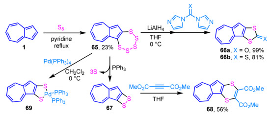 Synthesis and reactivity of azulenopentathiepin 65 were reported by Sato and his co-workers. Azulenopentathiepin 65 is prepared by the reaction of azulene (1) with elemental sulfur in pyridine under reflux conditions. The azulene derivatives, such as 66a and 66b, are prepared by the reaction of electrophiles such as iodomethane, methyl chloroformate, N,N′-carbonyldiimidazole and N,N′-thiocarbonyldiimidazole, with the bis(thiolate) obtained by the treatment of 65 with LiAlH4 (Scheme 21) [38]. PPh3–mediated desulfuration of pentathiepin 65, followed by the reaction with DMAD produces azuleno-1,4-dithiin 68 in 56% yield. The reaction of 65 with Pd(PPh3)4 gives the extremely unstable palladium complex 69 (6%), which is immediately converted to a binuclear complex.