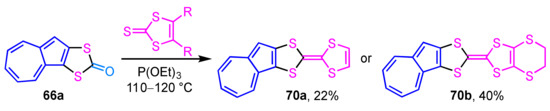 Starting from the dithiocarbonate derivative 66a, which was obtained by the reaction described above, the synthesis of azulene-fused TTFs 70a and 70b was achieved by the same group (Scheme 22) [39]. The condensation reaction of dithiocarbonate 66a with vinylene trithiocarbonate or ethylenedithio derivative in triethyl phosphite generates azulene-fused TTFs 70a and 70b in moderate yields (22% and 49%, respectively). The redox behavior of the azulene-fused TTFs was also investigated by cyclic voltammetry (CV).