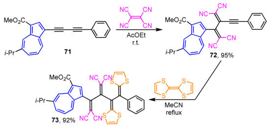 Synthesis of the donor–acceptor-type extended TTFs 73 incorporated into cross-conjugated systems is achieved by the sequential [2 + 2] cycloaddition–retroelectrocyclization reaction of electron-rich butadiyne with tetracyanoethylene followed by TTF (Scheme 23) [40]. Butadiyne 71 gives tetracyanobutadiene 72 by the reaction with tetracyanoethylene, which is then converted to 73 by the cycloaddition with TTF. The UV/Vis spectrum of 73 shows a strong and broad absorption band in the visible region (λmax = 471) owing to the overlapping of the charge-transfer (CT) absorption bands arising from both azulene and 1,2-bis(1,3-dithiol-2-ylidene)ethane donors to the tetracyanobutadiene acceptor unit. In the electrochemical analysis of 73, a reversible one-stage two-electron oxidation wave and a two-stage reduction wave are observed in CV.