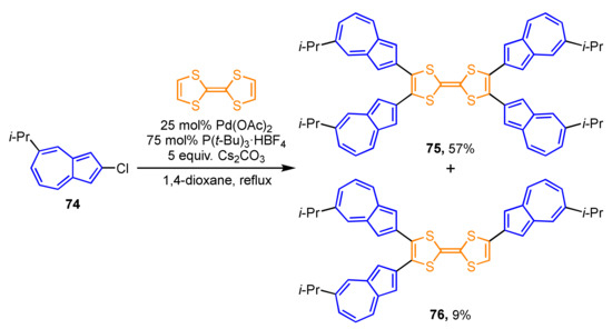 Synthesis of tetra(2-azulenyl)TTF 75 by the palladium-catalyzed C–H bond activation reaction.