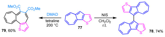 Thiophene-fused azulenes sometimes exhibit a different reactivity from that of usual azulene derivatives. Thiophene-fused 1,1′-biazulene derivative 78 is obtained by the reaction of azuleno[1,2-b]thiophene (77) with NIS, instead of the presumed iodoazulene derivative (Scheme 25) [42]. NIS is commonly known as an iodination reagent, but it may act as an oxidant in this case. Although the longest absorption band of 78 displayed larger absorption coefficients than that of 77, the absorption maxima are observed at almost the same wavelength region. The similarity of the absorption maxima of 77 and 78 suggests less effective conjugation due to the low planarity of the two azulene rings of 78. Compound 77 undergoes a sequential cycloaddition–reverse electron cyclization with DMAD under high temperature reaction conditions (200 °C) to give thiophene-fused heptalene 79 in 60% yield [43]. The presence of bond alternation and the nonaromatic nature of 79 are revealed by single-crystal X-ray crystallographic analysis.