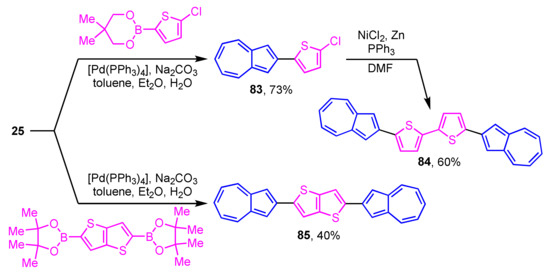 Some azulene derivatives are expected to be components of organic semiconductors due to their unique electronic properties. The synthesis of 2-arylazulene derivatives connected by 2,2′-bithiophene 84 and thieno[3,2-b]thiophene 85 by Suzuki–Miyaura cross-coupling reaction was reported by Katagiri et al. (Scheme 27) [45]. The single-crystal X-ray analysis revealed the herringbone packing in the crystal structure of 84 and 85. Compounds 84 and 85 are aligned almost perpendicular to the substrate in the film form and show the characteristics of an OFET having a hole mobility.