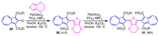 Direct preparation of 2-thienylazulene derivatives by employing the C–H bond activation reaction has also been reported (Scheme 29) [47]. The reaction of 2-chloroazulene derivative 89 with 3,4-ethylenedioxythiophene (EDOT) in the presence of Pd(OAc)2, PCy3·HBF4, pivalic acid (PivOH), and K2CO3 to produce 2-thienylazulene derivative 90 in 81% yield, which reacts further with 89 to afford symmetric 2,5-di(2-azulenyl)thiophene derivative 91 in 88% yield.