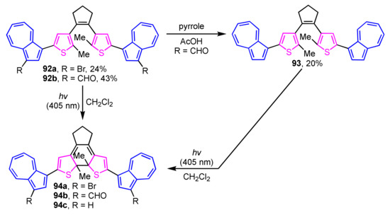 The synthesis of photochromic 1-(2-thienyl)azulene-based diarylethene derivatives 92a and 92b has been achieved by Nica and co-workers utilizing Suzuki–Miyaura cross-coupling reaction (Scheme 30) [48]. Compound 93 was also synthesized via deformylation by the treatment with pyrrole in acetic acid using 92b as a starting material. Photocyclization of compounds 92a, 92b, and 93 in CH2Cl2 takes place by irradiating the light at λex = 405 nm with the color change of the solution from greenish-yellow to blue-purple due to form ring-closing derivatives 94a–94c.