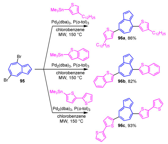 Synthesis of 1,3-di(5-aryl-2-thienyl)azulenes 88a and 88b by Stille cross-coupling reaction.