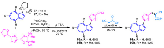 - Cowper, P.; Jin, Y.; Turton, M.D.; Kociok-Koehn, G.; Lewis, S.E. Azulenesulfonium Salts: Accessible, Stable, and Versatile Reagents for Cross-Coupling. Angew. Chem. Int. Ed. 2016, 55, 2564–2568. [Google Scholar] [CrossRef]