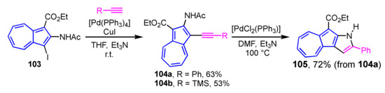 - Hyoudou, M.; Nakagawa, H.; Gunji, T.; Ito, Y.; Kawai, Y.; Ikeda, R.; Konakahara, T.; Abe, N. Synthesis, Cyclization, and Evaluation of the Anticancer Activity against HeLa S-3 Cells of Ethyl 2-Acetylamino-3-ethynylazulene-1-carboxylates. Heterocycles 2012, 86, 233–244. [Google Scholar] [CrossRef]