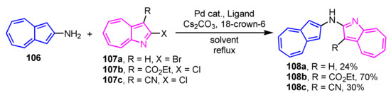 - Shoji, T.; Maruyama, A.; Araki, T.; Ito, S.; Okujima, T. Synthesis of 2- and 6-thienylazulenes by palladium-catalyzed direct arylation of 2- and 6-haloazulenes with thiophene derivatives. Org. Biomol. Chem. 2015, 13, 10191–10197. [Google Scholar] [CrossRef] [PubMed]