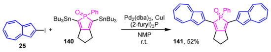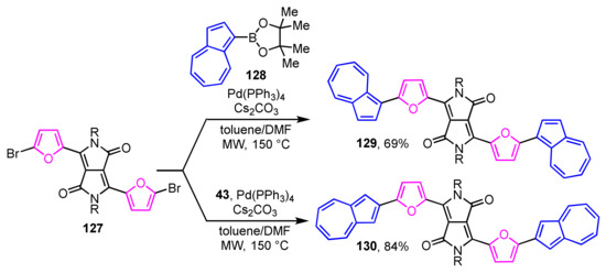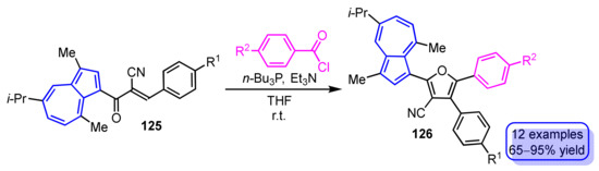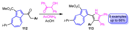 Due to their unique optical and electrochemical properties, heterocycle-substituted and heterocycle-fused azulene derivatives are expected to be applied to organic materials such as organic light-emitting diodes (OLEDs), organic field effect transistors (OFETs), solar cells, and biosensors. Therefore, many researchers have studied the synthesis, reactivity, and properties of these derivatives, as discussed below. Several review articles on the classical heterocycle-substituted and heterocycle-fused azulene derivatives have been published so far [8,9,10,11,12,13,14,15,16,17]. However, there is no systematic review of the progress in the synthesis and reactivity of these derivatives within the last decade. Herein, we describe the development of heterocycle-substituted and heterocycle-fused azulene derivatives in the last decade.