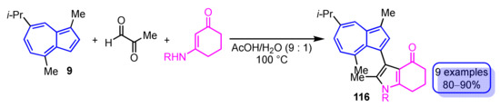 - Wang, D.-L.; Dong, Z.; Cui, Q.-T.; Yang, F.-F.; Zhao, W. Synthesis of Some Pyrazole-Fused Pyrido[3,2-a]azulenes. Heterocycles 2013, 87, 2343–2350. [Google Scholar] [CrossRef]