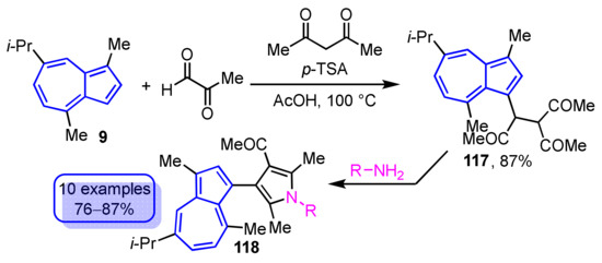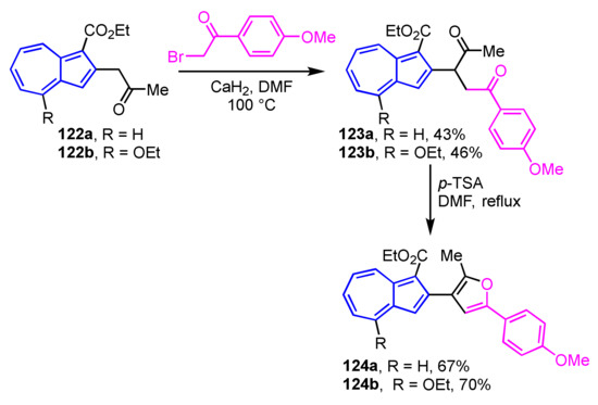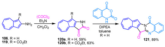 - Fischer, G. Azulenes Fused to Heterocycles. Adv. Heterocyclic Chem. 2009, 97, 131–218. [Google Scholar]