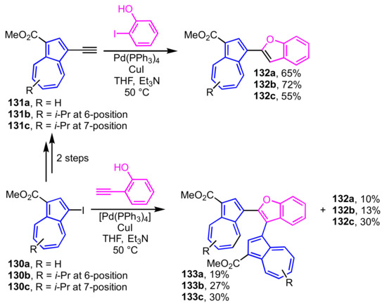 - Shoji, T.; Tanaka, M.; Takagaki, S.; Miura, K.; Ohta, A.; Sekiguchi, R.; Ito, S.; Mori, S.; Okujima, T. Synthesis of azulene-substituted benzofurans and isocoumarins via intramolecular cyclization of 1-ethynylazulenes, and their structural and optical properties. Org. Biomol. Chem. 2018, 16, 480–489. [Google Scholar] [CrossRef] [PubMed]