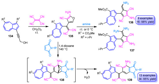 - Shoji, T.; Nagai, D.; Tanaka, M.; Araki, T.; Ohta, A.; Sekiguchi, R.; Ito, S.; Mori, S.; Okujima, T. Synthesis of 2-Aminofurans by Sequential [2+2] Cycloaddition–Nucleophilic Addition of 2-Propyn-1-ols with Tetracyanoethylene and Amine-Induced Transformation into 6-Aminopentafulvenes. Chem. Eur. J. 2017, 23, 5126–5136. [Google Scholar] [CrossRef] [PubMed]
