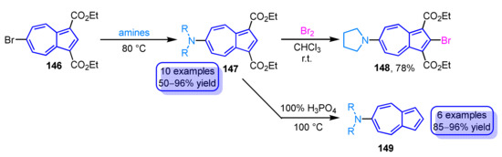 - Shoji, T.; Sugiyama, S.; Takeuchi, M.; Ohta, A.; Sekiguchi, R.; Ito, S.; Yatsu, T.; Okujima, T.; Yasunami, M. Synthesis of 6-Amino- and 6-Arylazoazulenes via Nucleophilic Aromatic Substitution and Their Reactivity and Properties. J. Org. Chem. 2019, 84, 1257–1275. [Google Scholar] [CrossRef]