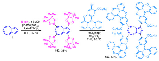 - Nishimura, H.; Eliseeva, M.N.; Wakamiya, A.; Scott, L.T. 3,5,7-Tetra(Bpin)azulene by Exhaustive Direct Borylation of Azulene and 5,7-Di(Bpin)azulene by Selective Subsequent Deborylation. Synlett 2015, 26, 1578–1580. [Google Scholar]