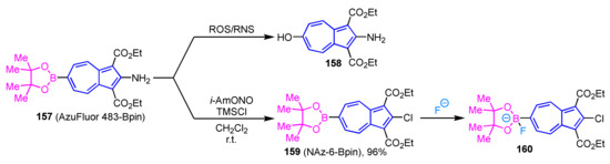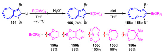 - Murafuji, T.; Shintaku, K.; Nagao, K.; Mikata, Y.; Ishiguro, K.; Kamijo, S. Synthesis and Structural Characterization of Diazulenylborinic Acid. Heterocycles 2017, 94, 676–690. [Google Scholar] [CrossRef]