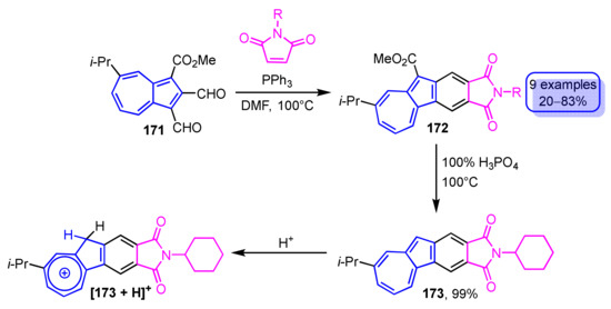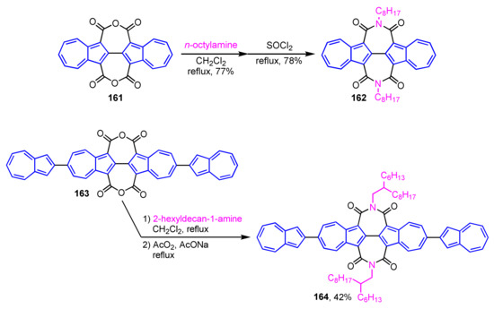 - Shoji, T.; Araki, T.; Iida, N.; Miura, K.; Ohta, A.; Sekiguchi, R.; Ito, S.; Okujima, T. Synthesis of azulenophthalimides by phosphine-mediated annulation of 1,2-diformylazulenes with maleimides. Org. Chem. Front. 2019, 6, 195–204. [Google Scholar] [CrossRef]