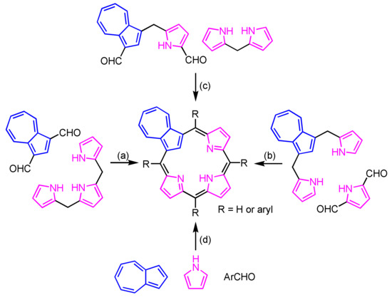 - Lash, T.D.; Lammer, A.D.; Idate, A.S.; Colby, D.A.; White, K. Preparation of Azulene-Derived Fulvenedialdehydes and Their Application to the Synthesis of Stable adj-Dicarbaporphyrinoids. J. Org. Chem. 2012, 77, 2368–2381. [Google Scholar] [CrossRef]