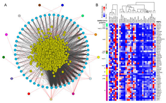 Further, we observed that, among the SARS-CoV-2-encoded proteins, the majority of the direct interactions occurred with a range of nonstructural proteins (nsp 2, 5, 8, 9, 11, and 13) that contribute to viral replication and transcription, along with the structural proteins (E, N, and M) (Figure 1A). Therefore, it is likely that the identified human RBPs that interact with the viral proteins assist in the viral pathogenesis. Furthermore, we also observed that ~65% of annotated human RBPs [55] were in immediate neighborhood (obtained from BioGRID [56], shown at the center in Figure 1A) of the virus protein-interacting RBPs and could indirectly regulate the SARS-CoV-2 proteins. Overall, the comprehensive direct and indirect interactions between human RBPs and SARS-CoV-2 proteins are likely to rewire the post-transcriptional gene regulatory mechanisms in human cells.