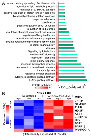 Differential expression analysis of mock-treated vs. SARS-CoV-2-infected primary human lung epithelial cells. (A) Bar plot illustrating the significant pathways obtained from the Gene Ontology (GO) term-based functional grouping of Differentially Expressed Genes (DEGs) at 5% False Discovery Rate (FDR) using ClueGO analysis (Cytoscape plugin) (B) Row normalized expression profile of differentially expressed RBPs in mock-treated and SARS-CoV-2-infected primary human lung epithelial cells (in biological triplicates). NHBE: normal vs. SARS-CoV-2-infected human bronchial epithelial cells.