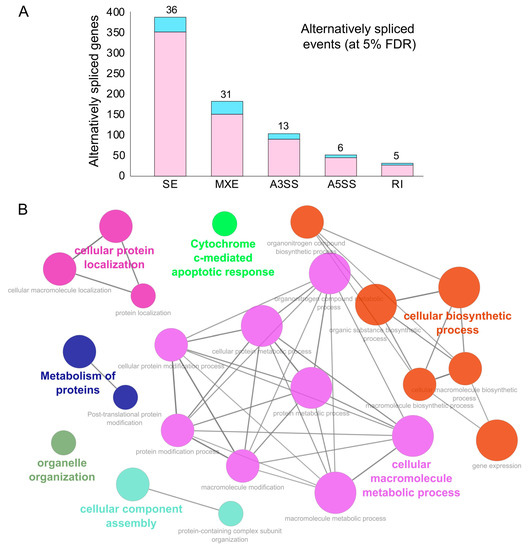 We used rMATS (replicate Multivariate Analysis of Transcript Splicing) [78] to identify differential alternative splicing (AS) events between the mock vs. SARS-CoV-2-treated NHBE cells. rMATS used sorted BAM (Binary Alignment/Map) files, obtained from aligning the fastq files against the hg38 reference genome using HISAT (as discussed above). It also uses a GTF file (gene transfer file format), downloaded from Ensembl (version 97) [107] for the existing annotation of exons. Briefly, rMATS enabled the analysis of the inclusion/exclusion of target exons/introns, contributing to different types of alternative splicing events, namely skipped exon (SE), alternative 5′ splice site (A5SS), alternative 3′ splice site (A3SS), mutually exclusive exons (MXE), and retained intron (RI), between pairs of conditions and provided the difference in the level of inclusion of an exon denoted by the Percentage Splicing Index () (as described previously [99]). Genes exhibiting alternatively spliced events detected below the 5% FDR threshold were documented in Supplementary Table S2. Functional enrichment analysis of these genes was performed using ClueGO [66] and documented in Supplementary Table S3.