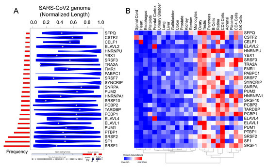 We obtained the RBP motifs from ATtRACT [83] and scanned across the SARS-CoV-2 viral genome using FIMO [82,108], with default parameters. Resulting genomic locations for each RBP motif were documented in Supplementary Table S4. For each binding motif, the scanned genomic location was normalized by considering the mid-point of the genomic coordinate divided with the SARS-CoV-2 genome length. Additionally, the occurrence of each RBP motif binding across the viral genome was computed. Statistically significant (p-value < 1 × 10−5) preferential binding profile of the RBP motifs (sorted by frequency of binding and greater than 10 sites) across the SARS-CoV-2 viral genome (length normalized) identified using FIMO [82] was visualized in the violin plot. Additionally, the protein abundance of the corresponding RBPs were extracted from the human proteome map [57] and represented as hierarchically clustered heatmaps across the tissues.