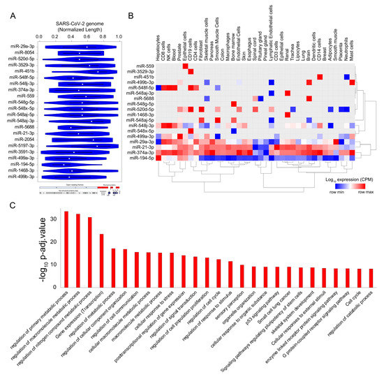 SARS-CoV-2 genome titrates the abundance of functionally important micro-RNAs (miRs) in human tissue. (A) Violin plot shows the statistically significant (p < 1 × 10−5) preferential binding profile of miR motifs (sorted by frequency of binding >15 sites) across the SARS-CoV-2 viral genome (length normalized) identified using FIMO. (B) Hierarchically clustered heatmap showing the log10 expression (Copies Per Million mapped reads (CPM), row normalized) of miRs across the tissues. (C) Bar plot illustrating the significant biological processes obtained from the gene ontology enrichment-based functional grouping of miR target genes (obtained from miRNet). Significant clustering (adj. p < 1 × 10−10) of genes enriched in GO biological processes generated by ClueGO analysis (Cytoscape plugin).
